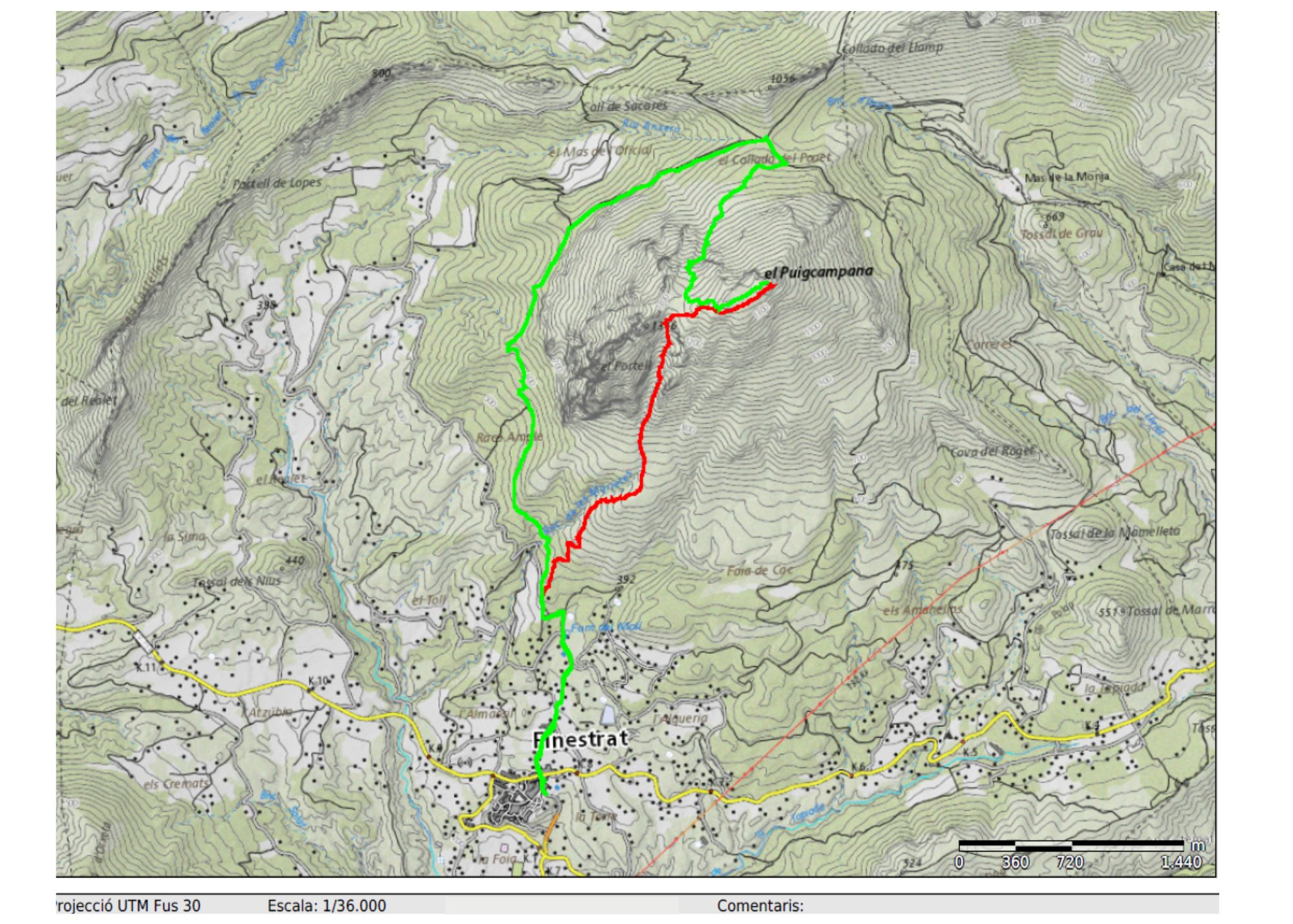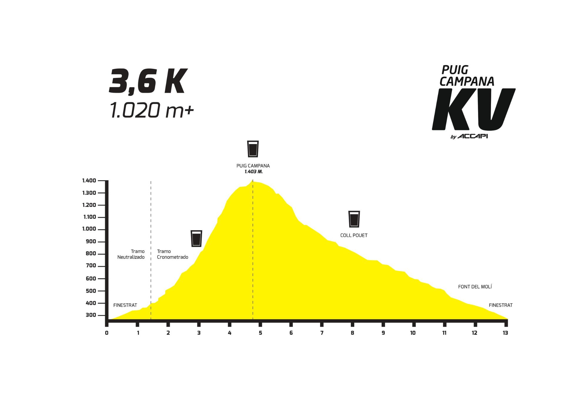 Se saldrá de la Plaza de la Unión Europea de Finestrat a la Font del Molí de forma neutralizada (1,550 Km. y 115 metros desnivel +) En la Font del Molí se dará inicio al crono que finalizará en la cumbre del Puig Campana (3,650 Km. y 1.020 m. de desnivel.