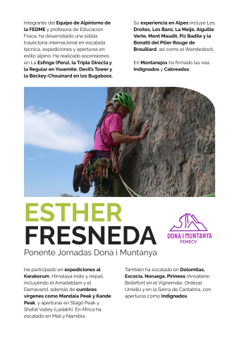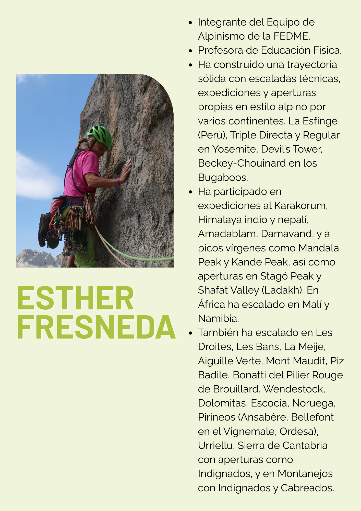 - Esther Fresneda alpinista de élite e integrante del equipo de alpinismo de la FEDME y profesora de educación física, que con la proyección de "Mucho más que paredes" nos mostrará su pasión por el alpinismo.