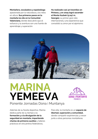 - Marina Yemeeva, Montañera, escaladora y espeleóloga apasionada por la naturaleza y los retos en altura. Miembro de la Vocalía de Mujer y Montaña de la FEMECV.