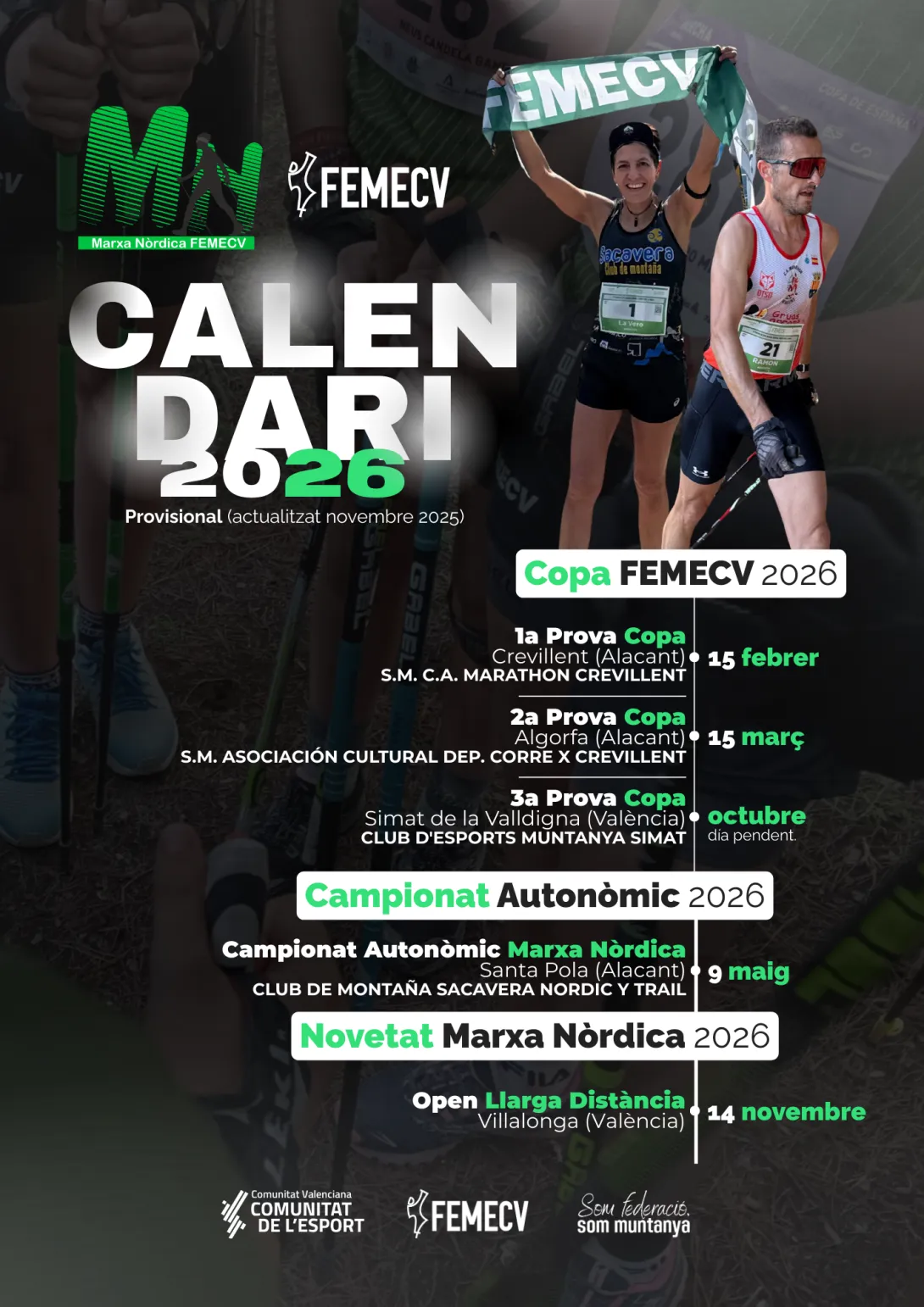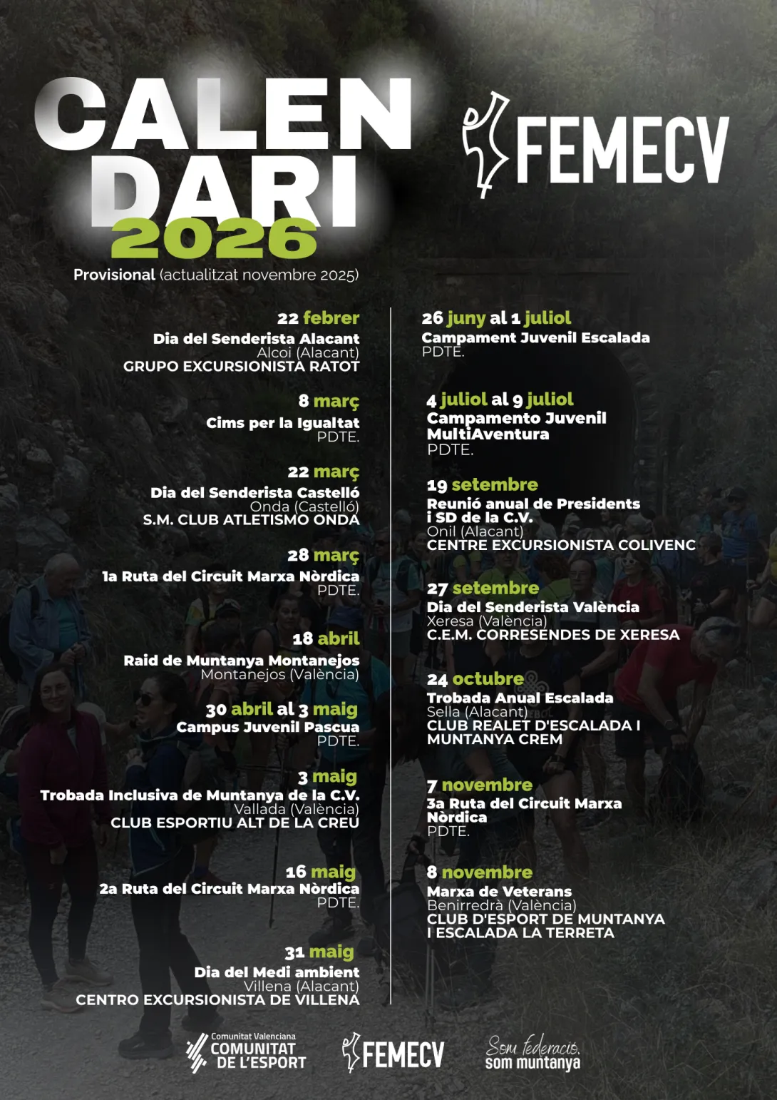 Des de la FEMECV volem agrair a cada club, vocalia, voluntària, àrbitre, tècnic i persona federada que forma part d'aquest projecte comú. El calendari 2026 és el reflex de la vostra il·lusió, el vostre esforç i el vostre compromís amb un muntanyisme que cuida de les persones i del territori.