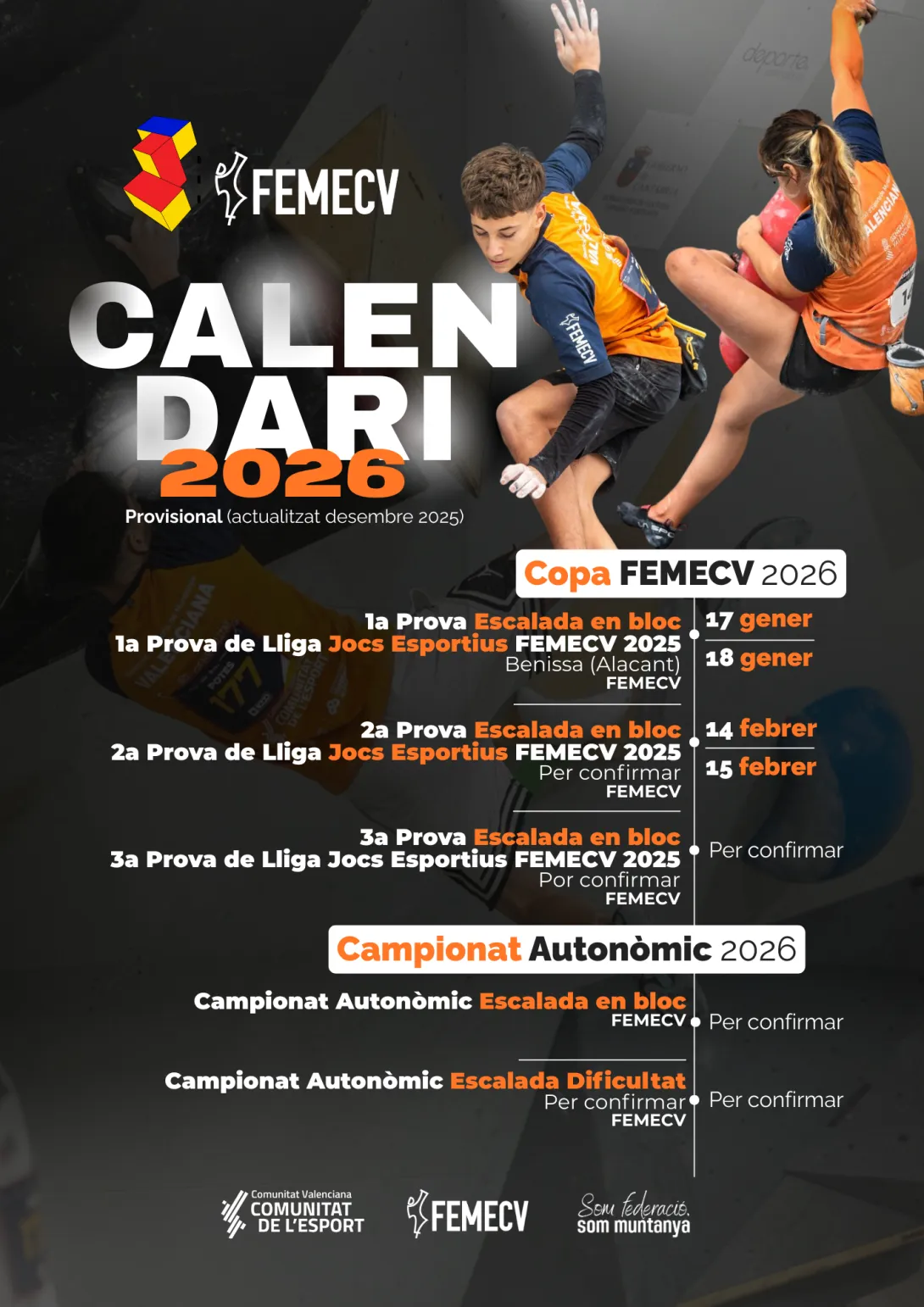 Després de publicar els calendaris de Marxa Nòrdica, Carreres per Muntanya i Activitats Associatives, tanquem oficialment la programació federativa amb la presentació del Calendari FEMECV d’Escalada en Bloc 2026, que se suma al conjunt de competicions i activitats aprovades el passat 15 de novembre en l’Assemblea General de la FEMECV.