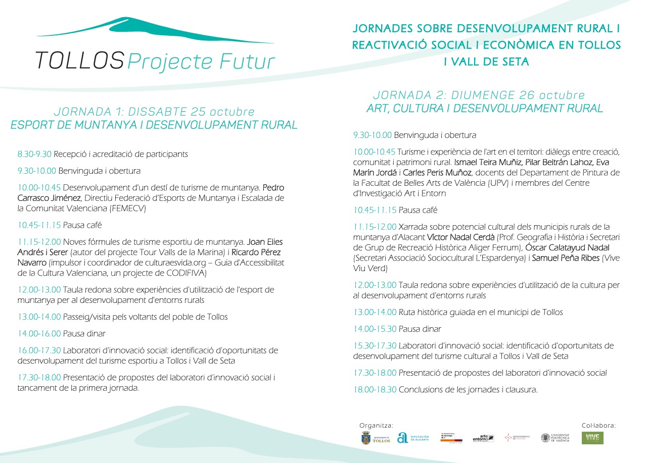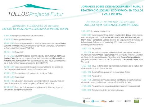 Les jornades se celebraran a la Sala Multiusos de Tollos, amb inscripció gratuïta i aforament limitat, i comptaran amb xarrades, taules redones, rutes senderistes i laboratoris d'innovació social orientats a generar propostes concretes per al territori.