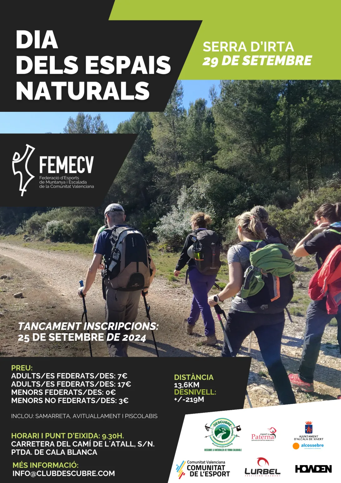 Descubre Club Senderismo y Marcha Nórdica, és el club que ha organitzat l'activitat senderista al Parc Natural de la Serra d'Irta, que compta amb un recorregut de 13,6km, desnivell + de 219m i desnivell – de 210m. Es recorre part d'una Sendera Homologada, el PR-CV 431, així com un bosc frondós on es realitzarà interpretació de la flora, fauna i història, i es vorejarà la mar.