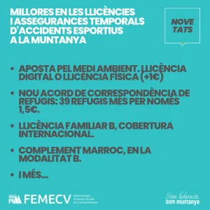 Es destaquen dues grans novetats per a aquesta temporada, accés a més refugis i llicències digitals com a format inicial i sostenible, i algunes altres millores en les condicions d'algunes de les modalitats, fruit de les negociacions que es realitzen amb l'objectiu de millorar les condicions cada temporada i atendre les necessitats que tant Clubs com federats i federades transmeten a la Junta Directiva: